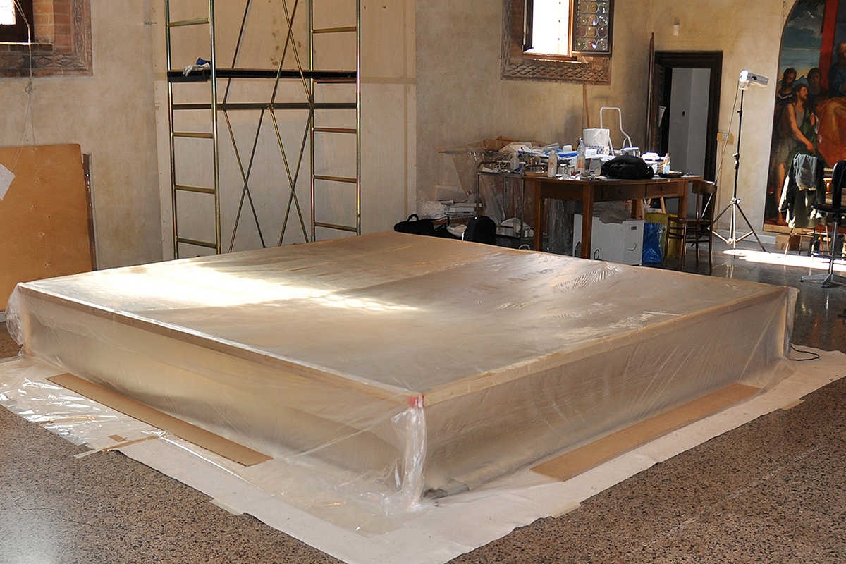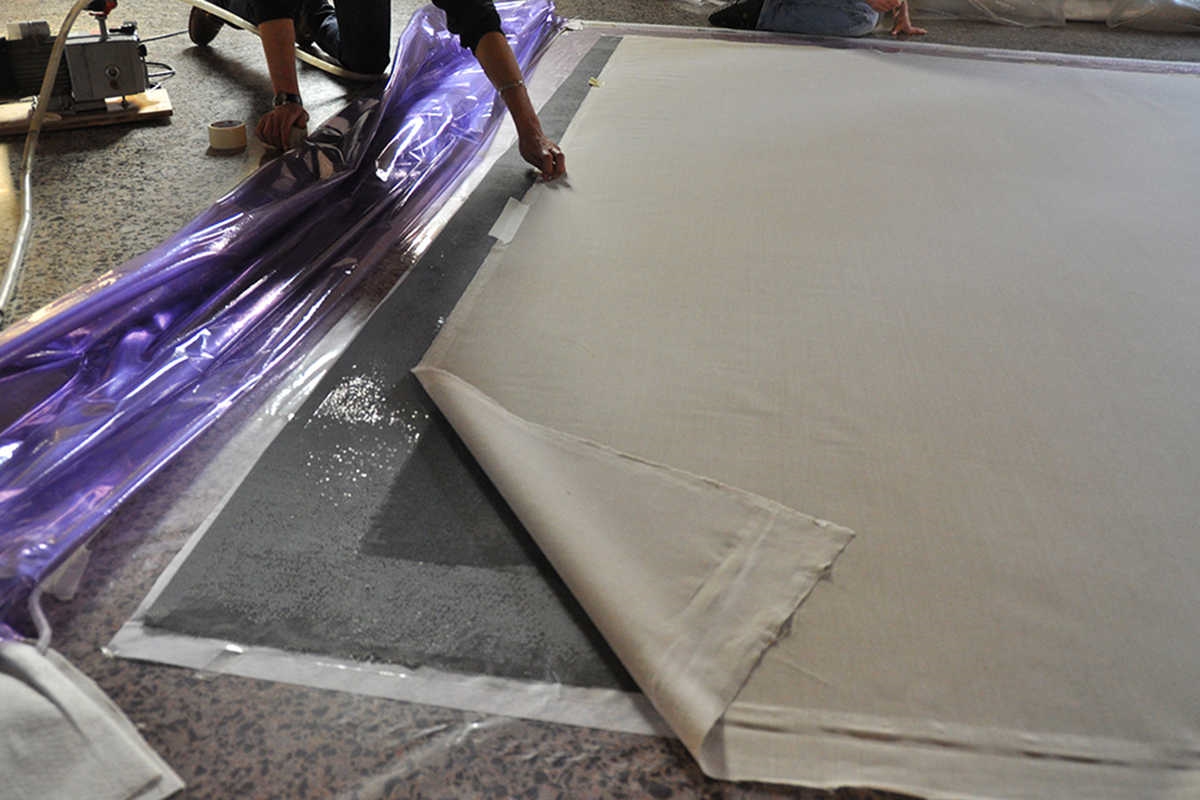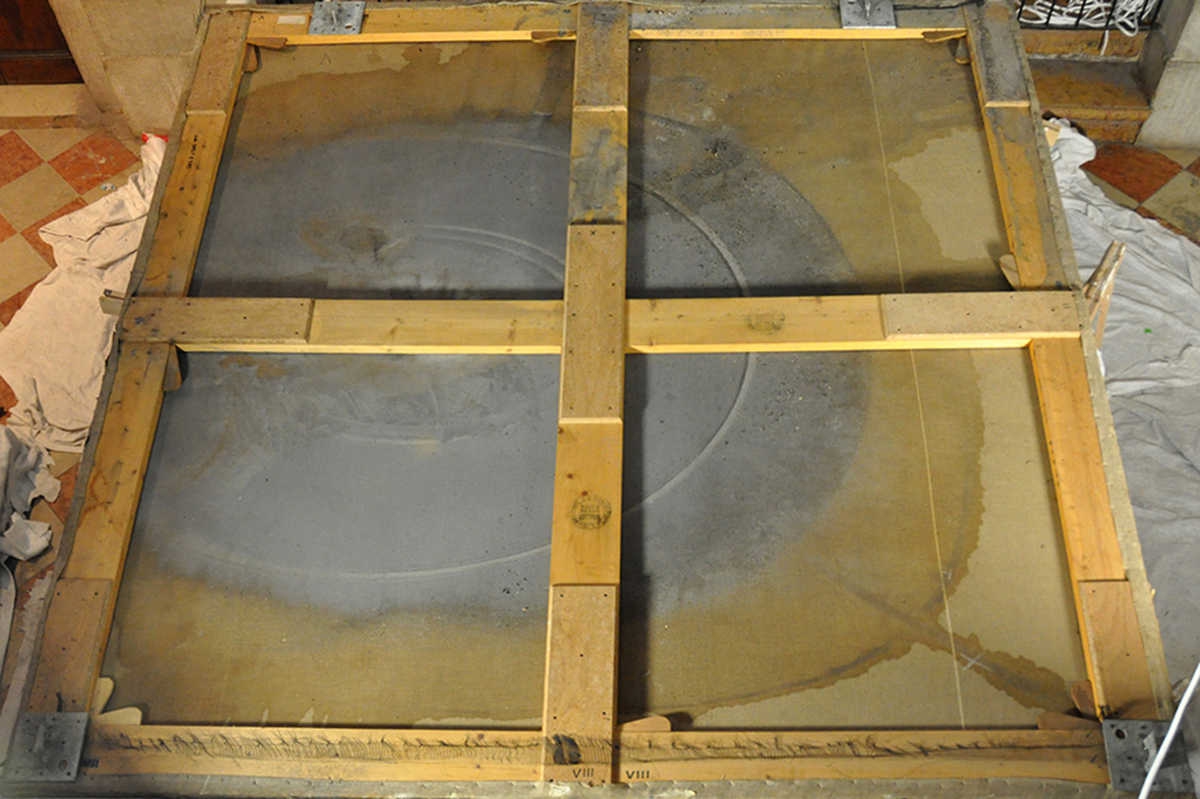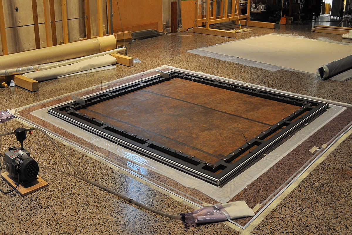Una sperimentazione su provini in camera climatica ha guidato la scelta del sistema consolidante. La foderatura, a freddo e a secco, con una sottilissima tela intermedia in carbonio ha permesso di ottenere un supporto leggero e ad alto modulo elastico. Il telaio, elastico a scorrimento perimetrale su rulli, permette un’omogenea distribuzione del tensionamento.