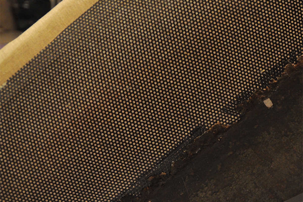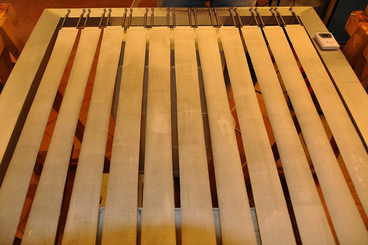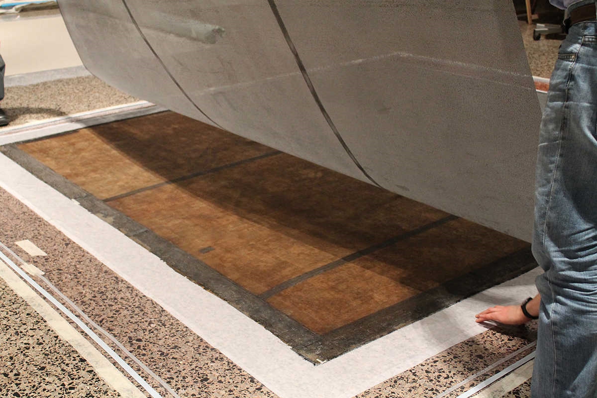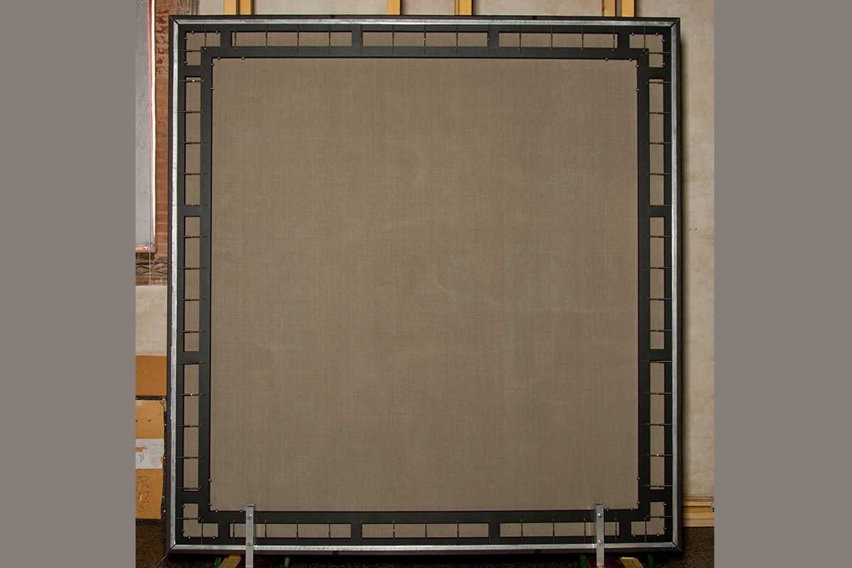 Una sperimentazione su provini in camera climatica ha guidato la scelta del sistema consolidante. La foderatura, a freddo e a secco, con una sottilissima tela intermedia in carbonio ha permesso di ottenere un supporto leggero e ad alto modulo elastico. Il telaio, elastico a scorrimento perimetrale su rulli, permette un’omogenea distribuzione del tensionamento.